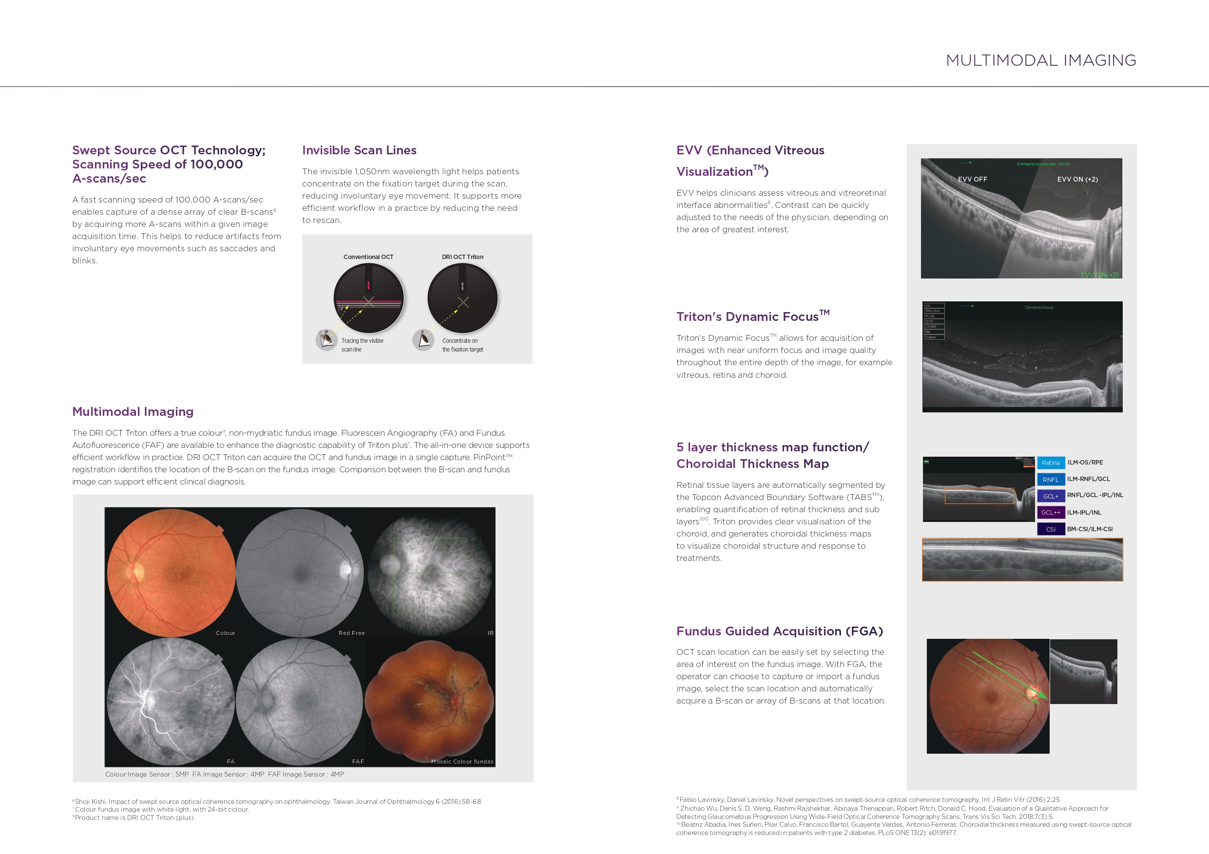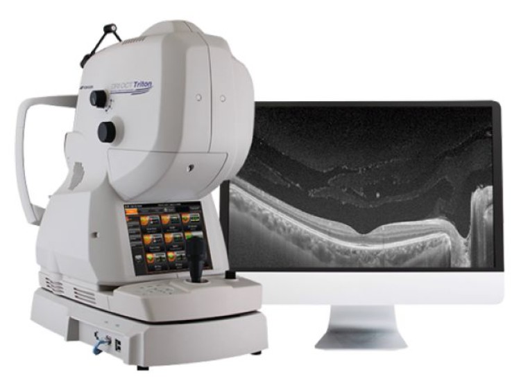 The Topcon DRI OCT Triton is a multimodal swept-source OCT system equipped with a non-mydriatic color fundus camera. Utilizing a 1,050 nm wavelength light source, and a scanning speed of 100,000 A Scans/sec, it provides uniform scanning sensitivity allowing superior visualization of the vitreous and choroid in the same scan.