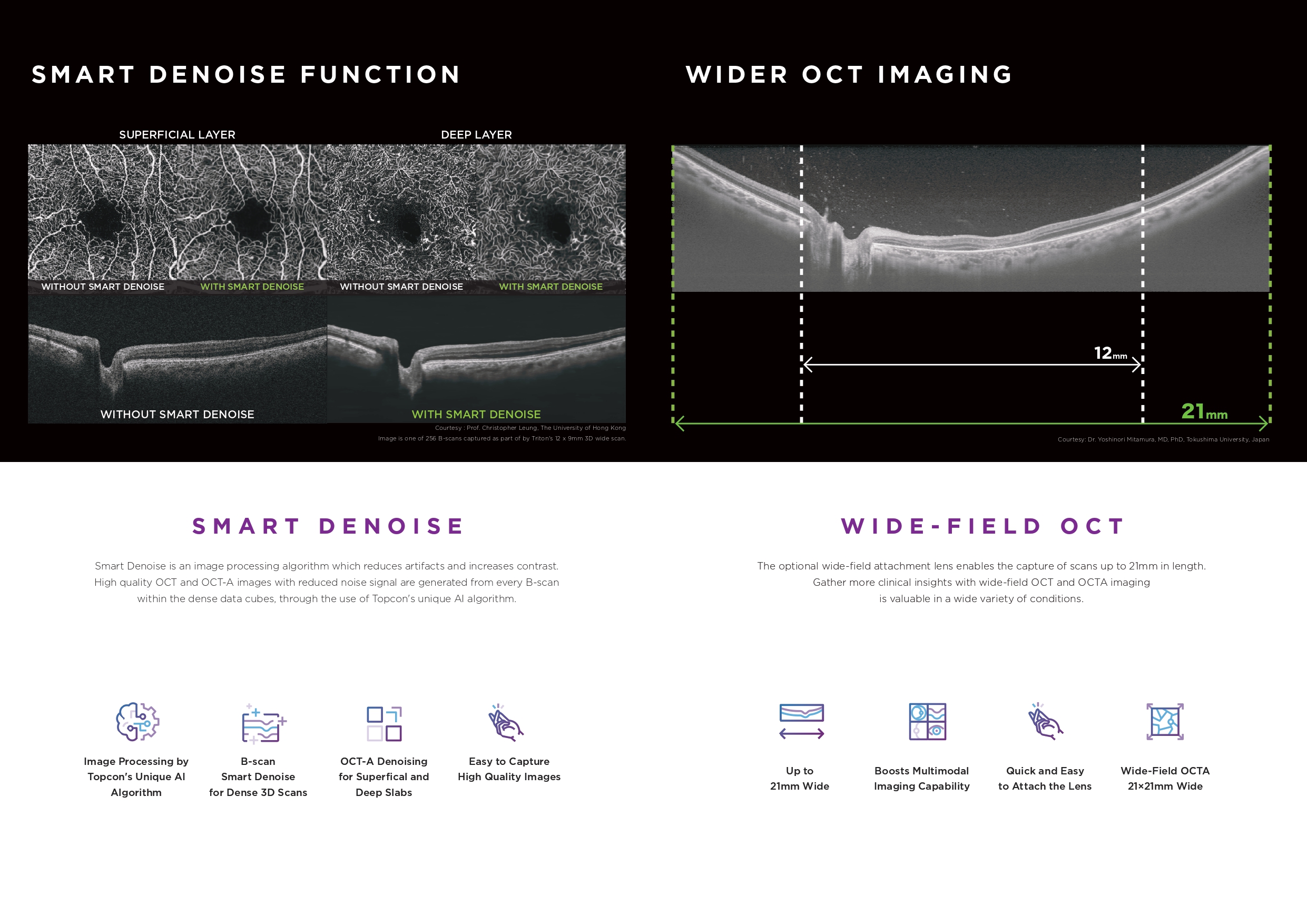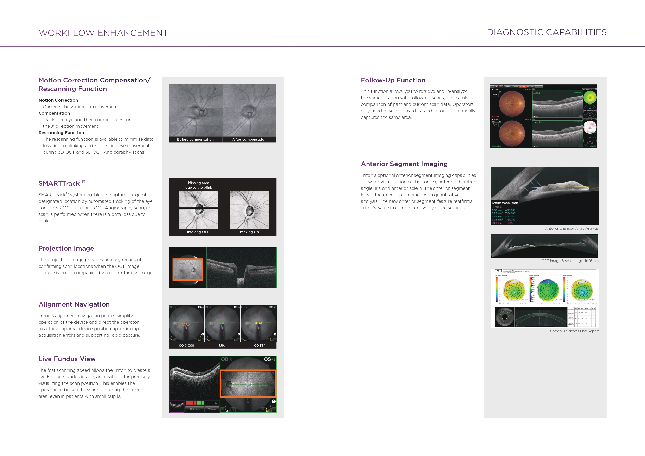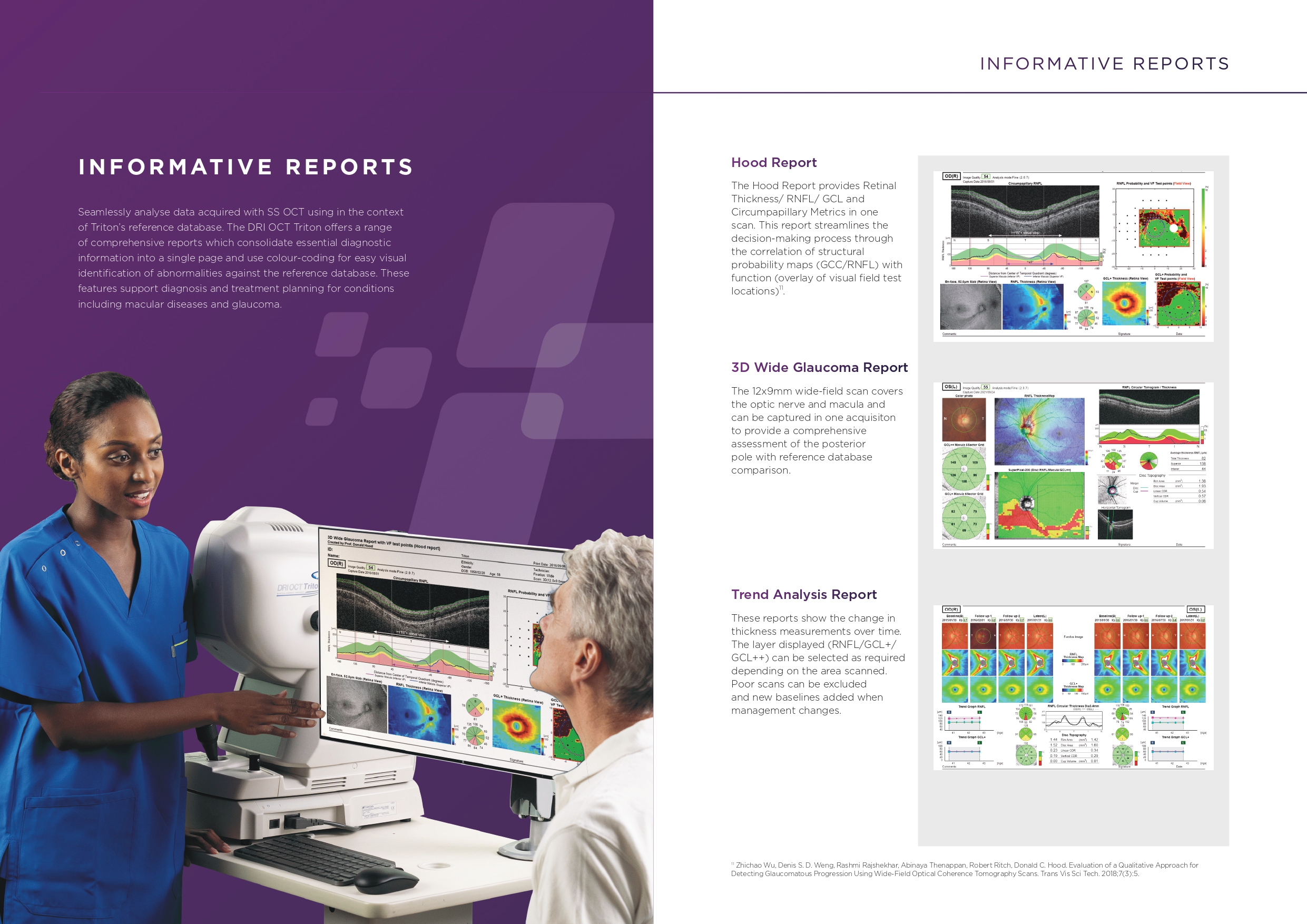Invisible OCT scanning light, eye tracking during the capture of selected scans, along with high scanning speeds reduce the effect of patient eye movement, improving workflow and allowing for more data be to collected in a shorter period. A 12 mm x 9 mm widefield scan along with automated layer segmentation provides measurement and topographical maps, with reference database, of the optic nerve and macula in one scan.