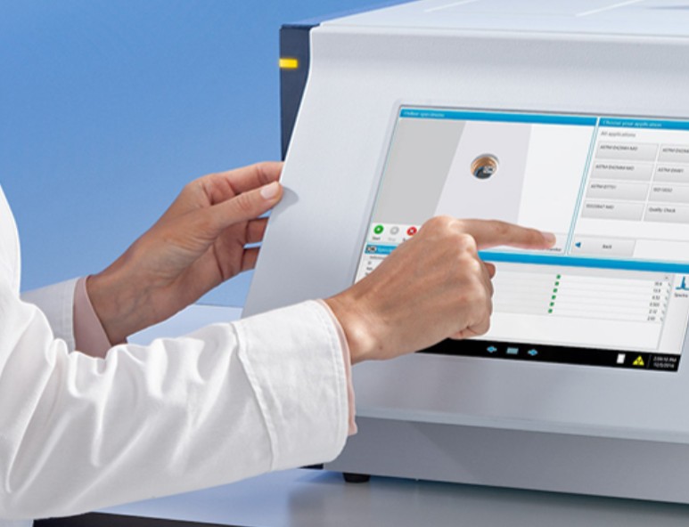 Compact benchtop instrument. Norms of additive analysis in lubricating oils. Measurment chamber with polymer sample. Easy use with touch control.