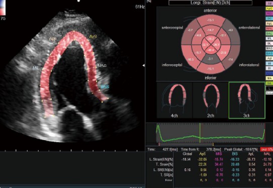 • 2D Tissue Tracking (2DTT) can be used in routine examinations to quantify the local movement of the whole left ventricle or myocardium. This contributes to the calculation of Global Longitudinal Strain (GLS), which has been recognised as an important parameter in the evaluation