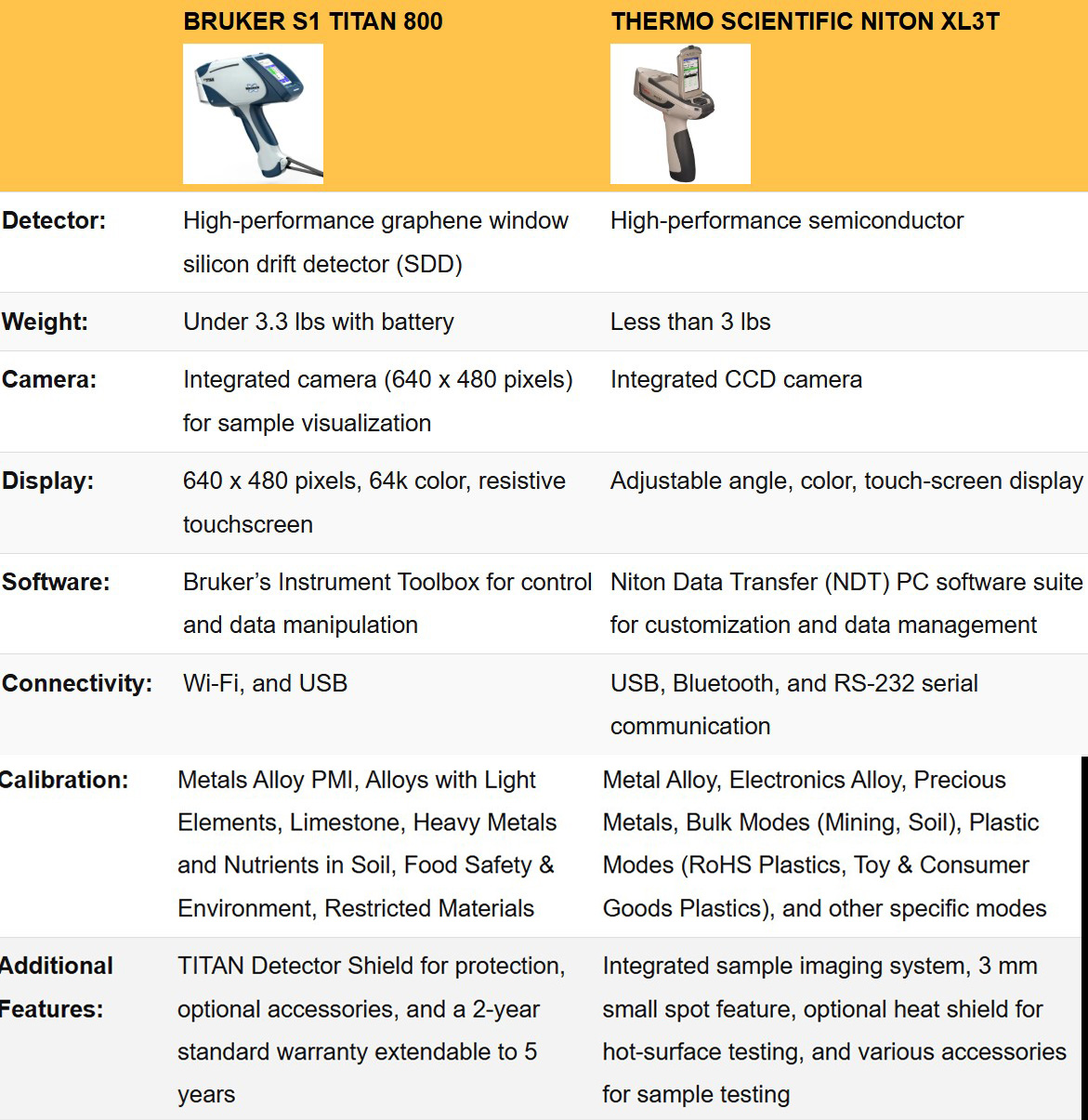| Bruker S1 Titan 800 | Thermo Scientific Niton XL3t | |